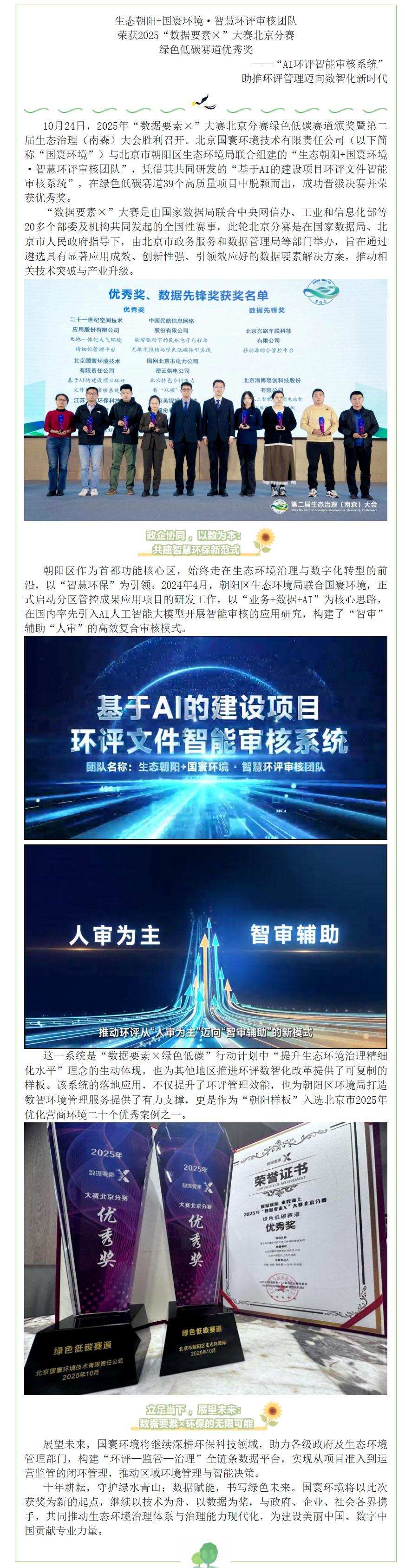 生态朝阳+国寰环境·智慧环评审核团队荣获2025“数据要素×”大赛北京分赛绿色低碳赛道优秀奖